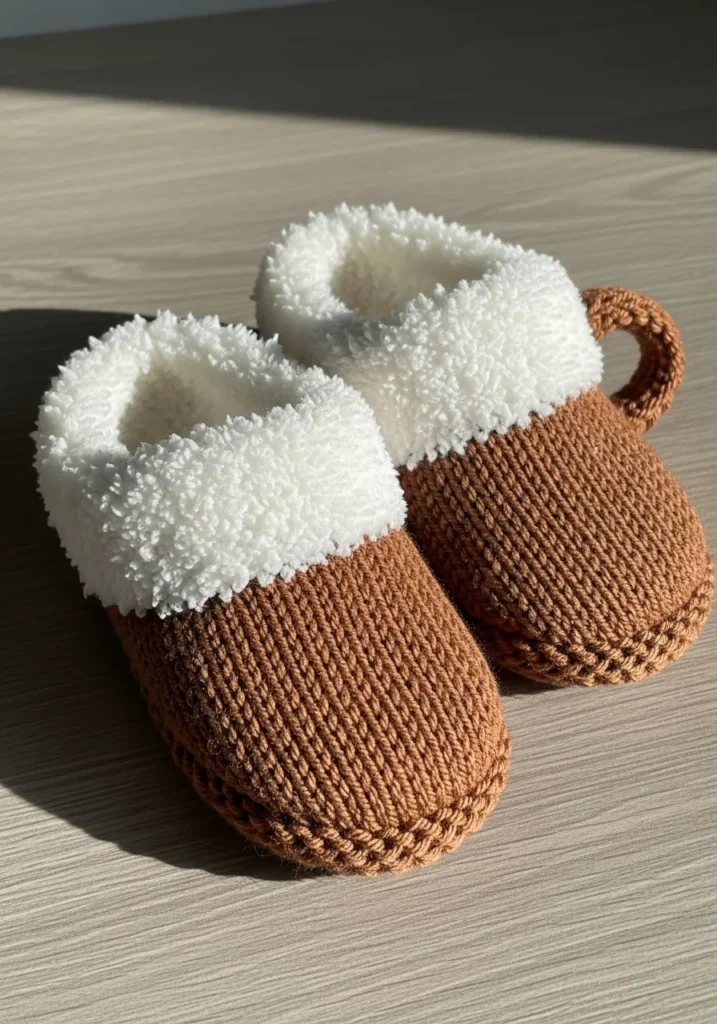 These cozy simple knitted slippers are designed to look like the cutest little mugs of hot cocoa. The main body is knit in a warm caramel brown yarn with a smooth, even texture that feels soft but sturdy. Around the top, a fluffy white cuff mimics whipped cream, adding a plush and slightly fuzzy contrast. One slipper even features a small knitted handle detail on the side, which makes the whole mug illusion extra charming. The rounded toes and thick knit sole give them that snug at home comfort we all want on chilly days.