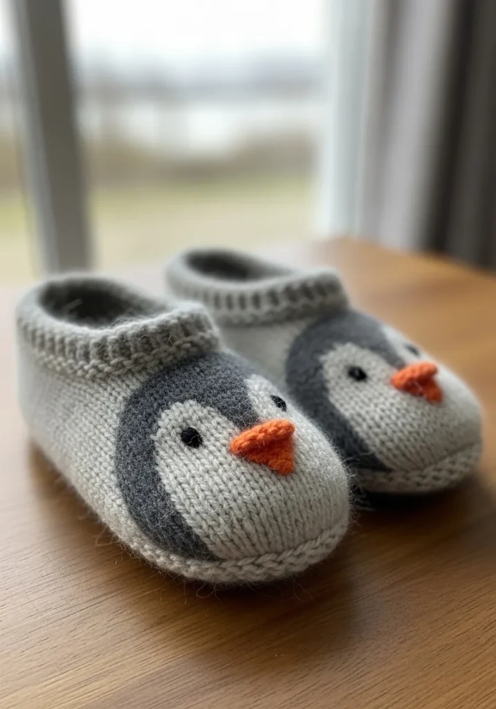 These cozy simple knitted slippers are designed with the cutest little penguin faces right on the toes. The base is knit in a soft light grey yarn with a smooth and snug texture that looks perfect for keeping feet warm. Each toe features a rounded white belly panel framed by darker grey sides, creating that classic penguin look. Tiny black stitched eyes and a bright orange knit beak bring the faces to life in the sweetest way. The cuffs are gently ribbed for a comfortable fit, and the thick knit sole adds that extra layer of at home comfort.