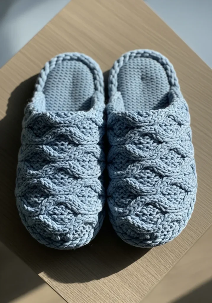 These cozy simple knitted slippers feature a beautiful braided cable pattern that runs across the entire top, creating a plush and textured surface. The yarn is a calming soft blue that feels fresh yet soothing, perfect for relaxed days at home. The thick cables add depth and structure, while the inside looks neatly finished with a smooth knit lining for extra comfort. The soles appear slightly padded and sturdy, giving them that snug at home comfort feel without looking bulky.