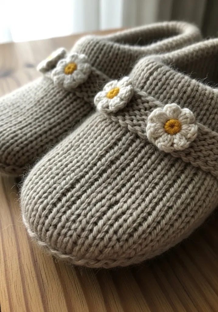 I love how something as simple as a flower can completely transform a basic slipper into a little statement piece. If you are comfortable knitting a straightforward slipper shape, adding a crocheted or knit flower on top is such an easy way to personalize it. I can totally see myself wearing these while padding around the kitchen on a slow morning, pretending my house is a cozy cottage full of sunshine.