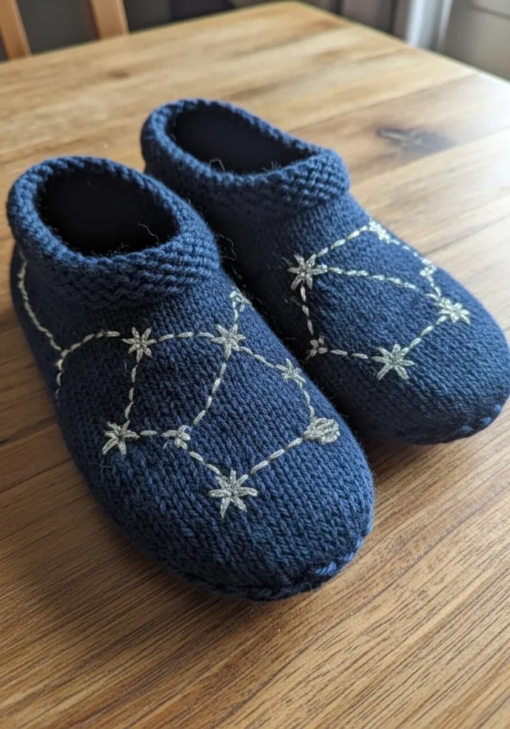 I absolutely love how these feel a little mysterious and special without being over the top. If you enjoy basic slipper knitting, adding a simple embroidered constellation is such an easy way to personalize your pair. I can imagine wearing these in the evening while winding down, feeling like I am carrying a little night sky around the house. They are cozy, creative, and just different enough to make everyday lounging feel extra lovely.