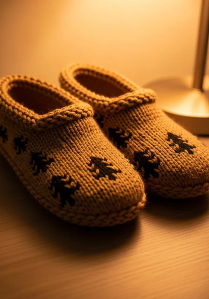 These cozy simple knitted slippers have the warmest cabin feel. The base is worked in a rich caramel brown yarn with a smooth knit texture and a slightly thicker garter edge around the sole for structure. Across the top, small black pine tree silhouettes are knit directly into the fabric, creating a subtle woodland pattern that feels calm and timeless. The cuffs are softly rounded and snug, making them easy to slip on while still keeping your feet warm. The overall look is simple, earthy, and perfect for at home comfort on chilly evenings.
