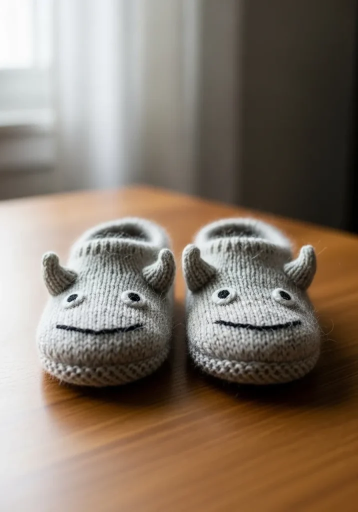 These cozy simple knitted slippers bring a playful twist to classic house shoes. The base is worked in a soft light grey yarn with a smooth knit texture and a slightly thicker sole edge for structure. On each toe, a cheerful monster face comes to life with tiny knit horns, stitched eyes, and a simple curved smile. The details are subtle but full of personality, giving the slippers a fun character without overwhelming the clean design. The shape stays rounded and snug, making them perfect for easy at home comfort.