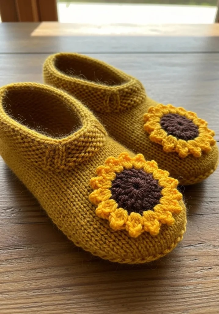 These cozy simple knitted slippers feature a warm mustard yellow base that instantly feels cheerful and homey. The body is worked in a smooth knit stitch with a softly rounded toe and a snug, low profile opening that hugs the foot. Right on the top of each slipper sits a bold sunflower motif with rich brown centers and textured golden petals that add a sweet pop of dimension. The yarn looks soft and slightly fuzzy, giving the whole pair that comfy handmade charm we all crave for at home comfort.