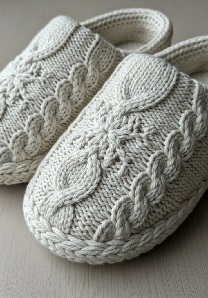 I love how these feel calm and grounded without being plain. If you enjoy basic slipper construction, adding a simple cable vine with tiny leaves is such a creative twist that looks impressive but is actually very doable. I can see myself wearing these while sipping tea on a rainy afternoon, pretending I live in a cozy cottage surrounded by trees. They feel thoughtful, unique, and still wonderfully practical for everyday lounging.