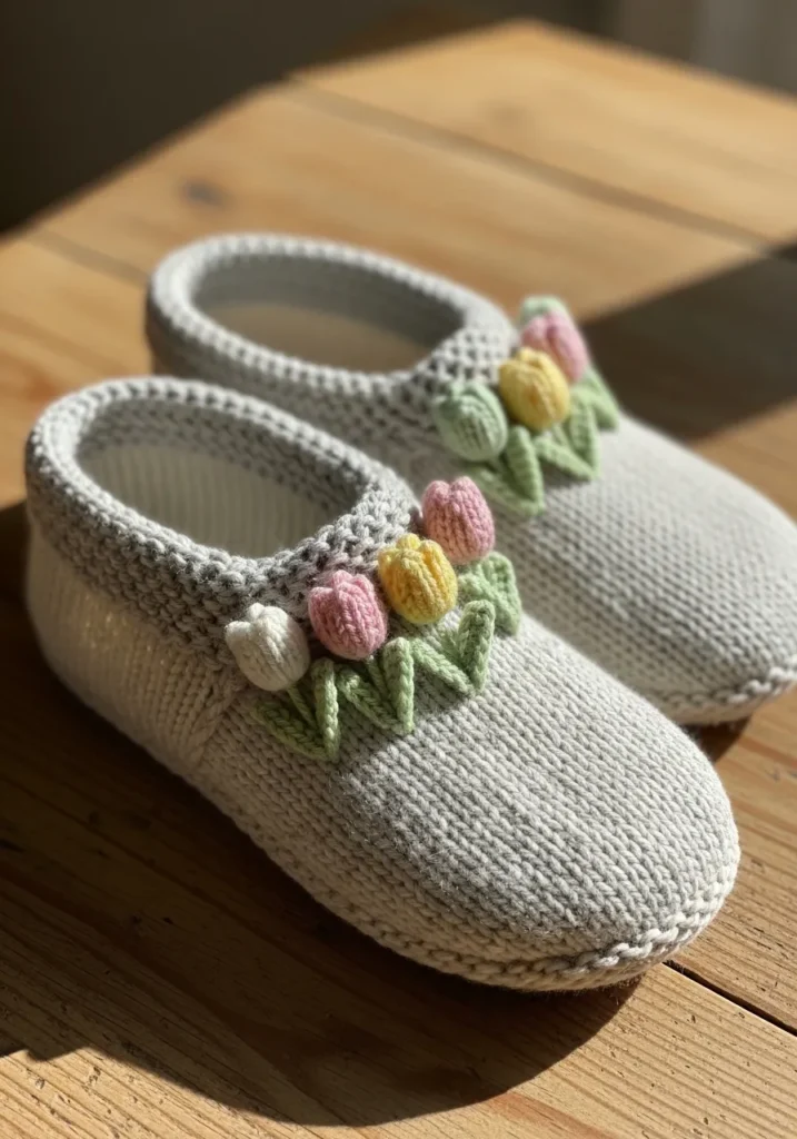 These cozy simple knitted slippers feel like a tiny spring garden for your feet. The base is worked in a soft light grey yarn with a smooth knit texture and a gently rounded toe. Across the top, a row of raised tulip appliqués blooms in pastel shades of pink, yellow, and cream, each with small green knitted leaves peeking out underneath. The cuff is neatly finished with a subtle ribbed edge, keeping the overall shape clean and comfortable. The design is simple at heart but elevated by those sweet floral details that add charm and personality for everyday at home comfort.