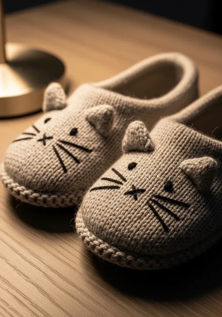 These cozy simple knitted slippers are all about sweet little details. The base is worked in a soft warm grey yarn with a smooth knit texture and a sturdy garter stitch edge around the sole. On each toe, a simple cat face is stitched in black yarn, complete with tiny eyes, a little nose, and delicate whiskers. Small knitted ears are sewn onto the top, giving the slippers a gentle three dimensional touch. The overall design is minimal but playful, perfect for relaxed at home comfort.