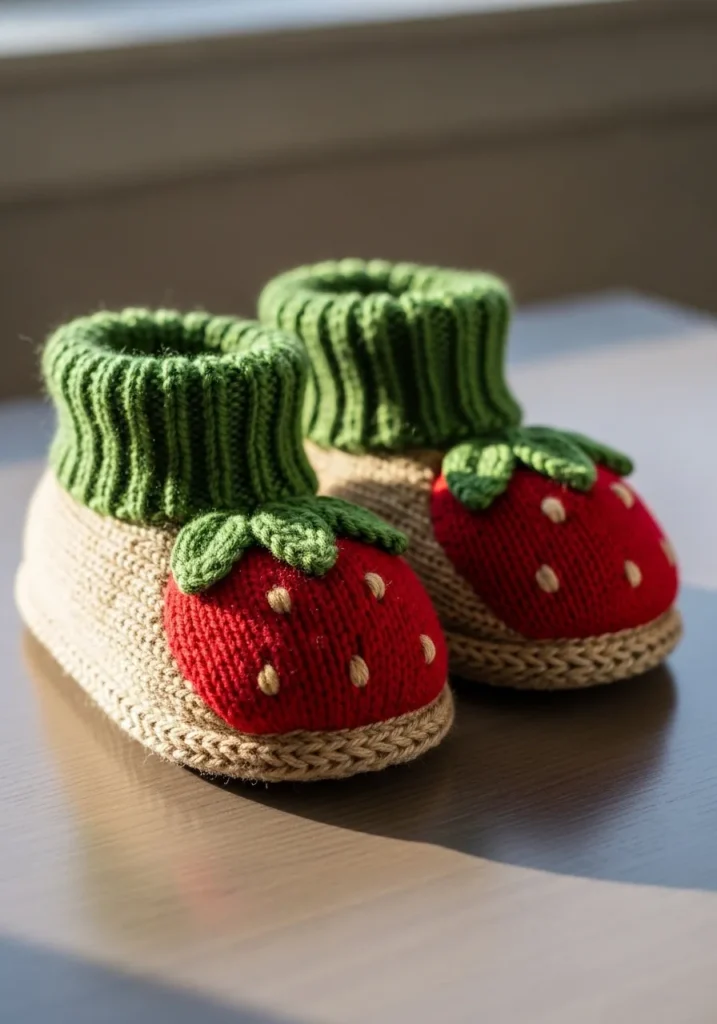 These cozy simple knitted slippers are designed to look like adorable strawberries, and I honestly cannot handle how cute they are. The base is knit in a soft neutral beige with a textured sole that looks sturdy and warm. The toes burst into bright red strawberry shapes with tiny cream seed stitches scattered across the surface. A leafy green knit detail sits right at the top, paired with chunky ribbed green cuffs that hug the ankles and add extra coziness. The yarn looks plush and slightly fuzzy, giving them that perfectly handmade at home comfort vibe.