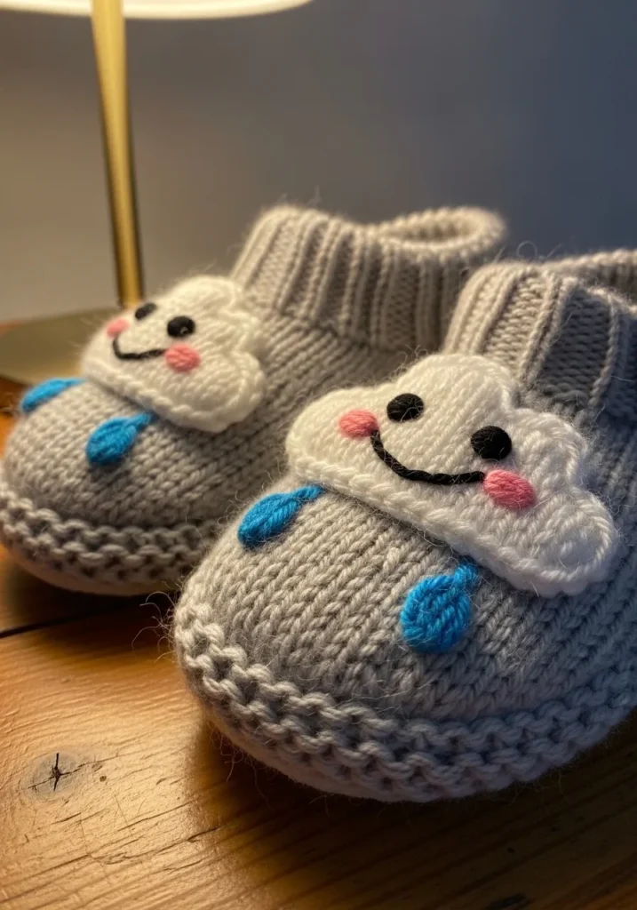 These cozy simple knitted slippers feature a soft grey base worked in a classic knit stitch with a thick garter edge around the sole for extra structure. The ribbed cuffs rise gently at the ankle, adding warmth and a snug fit. On the top of each slipper sits an adorable white cloud appliqué with tiny black stitched eyes, a curved smile, and rosy pink cheeks. Bright blue teardrop shapes below the cloud add a playful rainy day touch. The yarn looks plush and slightly fuzzy, giving the whole design that warm and handmade at home comfort feel.