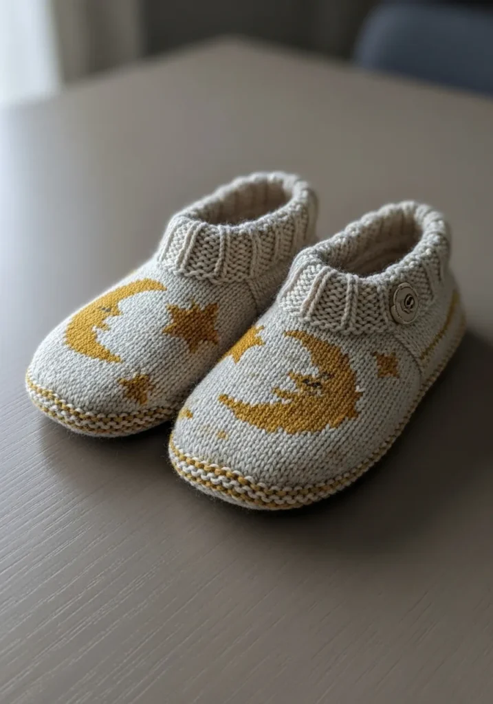 These cozy simple knitted slippers have the dreamiest nighttime vibe. The base is knit in a soft creamy beige yarn with a smooth, even texture and a snug ribbed cuff that gently hugs the ankle. Across the top, golden yellow crescent moons and scattered stars are worked into the fabric, creating a sweet celestial pattern that feels calm and magical. A small decorative button detail near the cuff adds a charming touch, and the garter stitch edging around the sole gives them a sturdy, handcrafted finish. The overall look is simple, warm, and perfect for at home comfort.