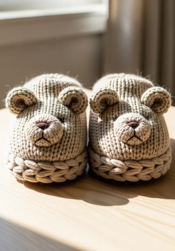 These cozy simple knitted slippers are shaped like the sweetest little bears, and they look unbelievably soft. The body is knit in a warm oatmeal beige yarn with a thick, plush texture that feels perfect for chilly floors. Each toe features a rounded bear face with tiny embroidered noses and subtle stitched mouths, plus small knit ears that sit right on top for extra charm. The soles are finished with a chunky braided edge that adds structure and a lovely handmade detail. The overall design is neutral, textured, and made for pure at home comfort.