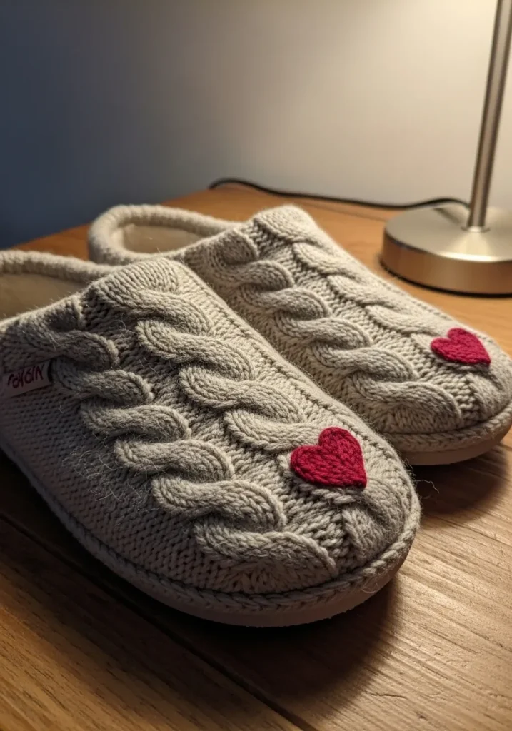 These cozy simple knitted slippers have that classic chunky cable look that instantly feels warm and comforting. The body is knit in a soft light grey yarn with bold braided cables running down the top of each slipper. The texture is thick and plush, giving them a sturdy yet cozy structure that is perfect for at home comfort. A small red knitted heart is stitched near the toe on each slipper, adding a sweet pop of color against the neutral base. The edges are neatly finished and the overall shape is simple and snug, almost like a cozy sweater for your feet.