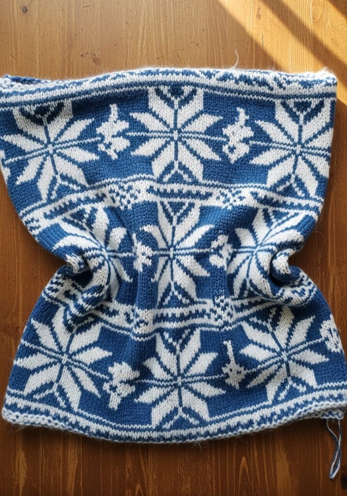 If the first scarf earlier in this list made you fall in love with that blue and white Nordic aesthetic, wait until you see what it looks like as a cowl. This stunning piece is worked in a rich denim blue and crisp white, featuring the most breathtakingly detailed large-scale snowflake and floral Fair Isle motifs that repeat all the way around the tube. The snowflakes are bold and graphic, almost filling the entire width of the cowl, which gives it this really dramatic and luxurious look that a smaller repeating pattern just cannot achieve. The yarn looks smooth and well-spun with excellent stitch definition, which is exactly what you want when your colorwork is this intricate and detailed. The clean cast-on and bind-off edges keep the whole thing looking polished and intentional from top to bottom.