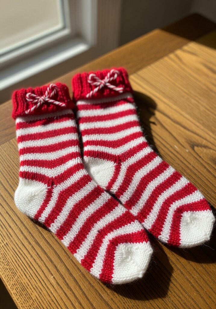 Striped socks are honestly one of my favorite things to knit because the color changes keep things interesting without requiring you to follow a complicated chart or pattern. You just knit your stripes and watch that candy cane magic happen row by row, which is so satisfying and almost a little meditative once you get into the rhythm of it. I also love that the little bow detail at the top is such a simple addition that makes a huge difference to the overall look. These would make the most adorable handmade Christmas gift tucked into a stocking, or honestly just keep them for yourself because your feet deserve to be this festive.