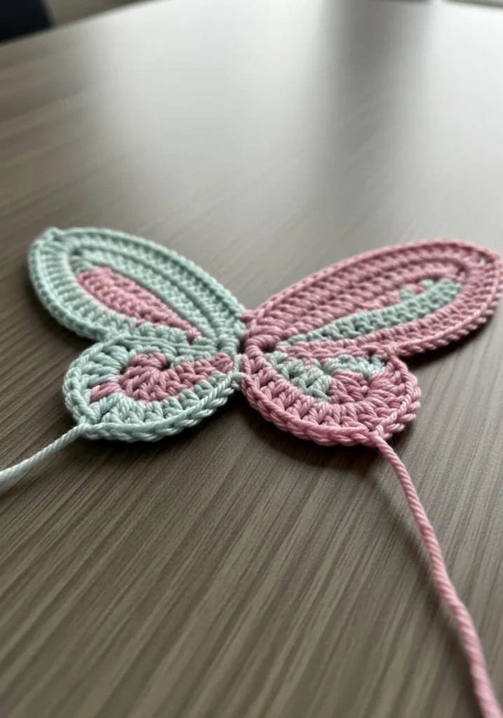 This adorable dragonfly applique is crocheted in soft pink and mint green yarn, shaped with elongated wings and a slim body that trails into a delicate tail. The wings are slightly textured with simple stitches that define their shape without making them bulky. The yarn appears lightweight and smooth, which keeps the piece flat and perfect for sewing onto bags, baby blankets, or summer tops. The gentle color combination gives it a sweet and whimsical vibe that instantly stands out.