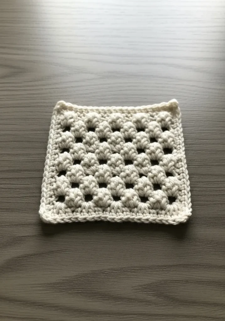 This crochet square highlights a light and airy cluster stitch pattern worked in a soft cream yarn. The tiny, evenly spaced clusters create a grid of small raised dots, giving the fabric both structure and breathability. The yarn looks like a medium weight cotton or acrylic, which helps the stitch definition stand out clearly. The overall design feels balanced and tidy, making it perfect as a stitch sampler or a base for larger projects.