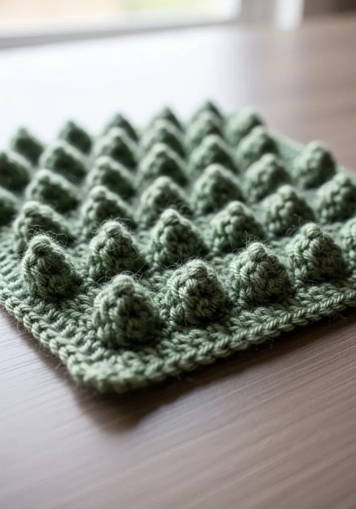 This rich green crochet swatch features evenly spaced bobbles arranged in a neat grid pattern. The raised bumps create a bold, tactile surface that almost looks like little mossy dots popping off the fabric. The yarn seems thick and cozy, giving the bobbles plenty of structure and making the overall square feel plush and warm. The deep green shade adds a natural, earthy vibe that makes the texture stand out even more.