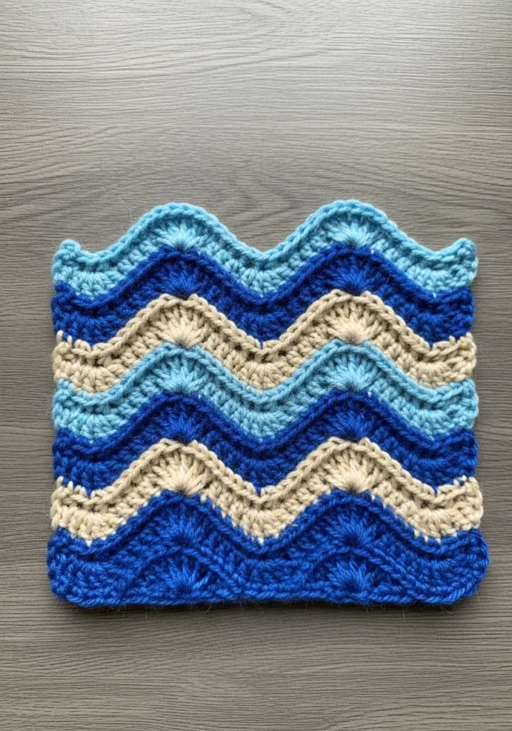 This vibrant square features bold ripple waves in layered shades of blue and soft cream, creating a flowing zigzag pattern that feels lively and fresh. The alternating colors highlight the peaks and valleys of the stitch, while the slightly raised texture adds depth and movement. The yarn appears soft and medium weight, making the waves look structured yet cozy.