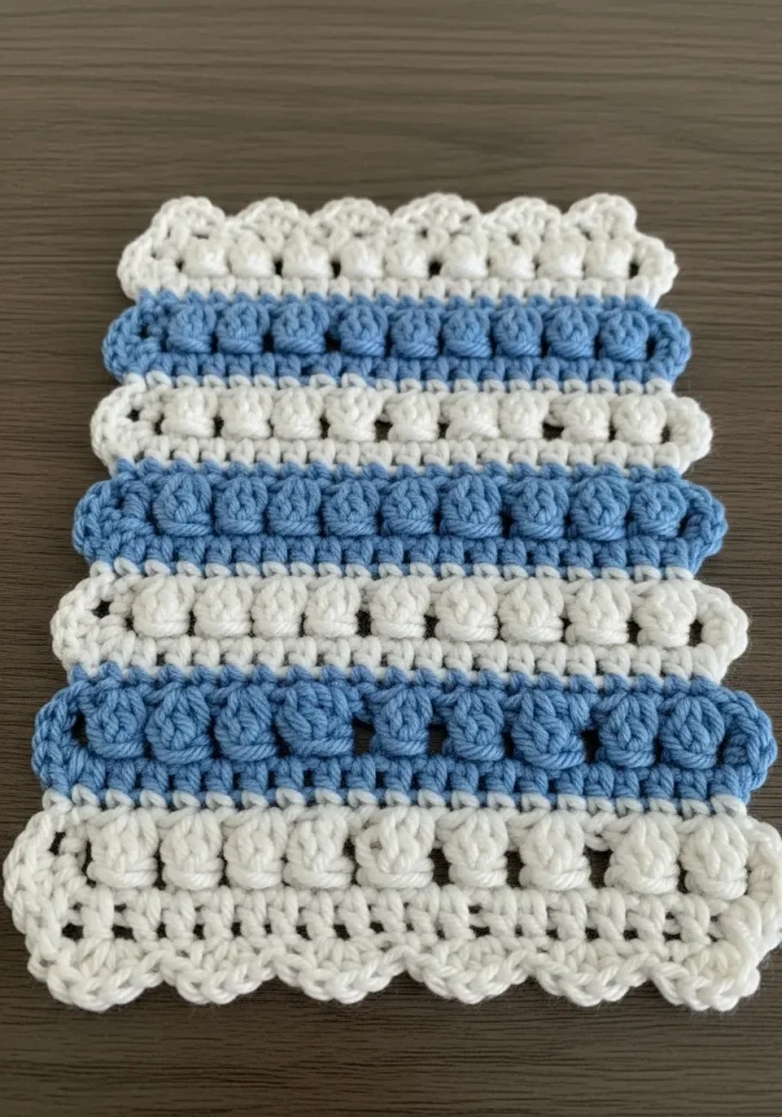 This rectangular crochet swatch features alternating rows of soft blue and creamy white yarn worked in chunky textured stitches. The pattern creates raised horizontal ridges that almost look like tiny waves stacked neatly on top of each other. The edges are finished with a scalloped border in white, giving the whole piece a sweet handmade charm. The yarn looks medium weight and cozy, with a slightly plush texture that makes the stitch definition stand out beautifully.