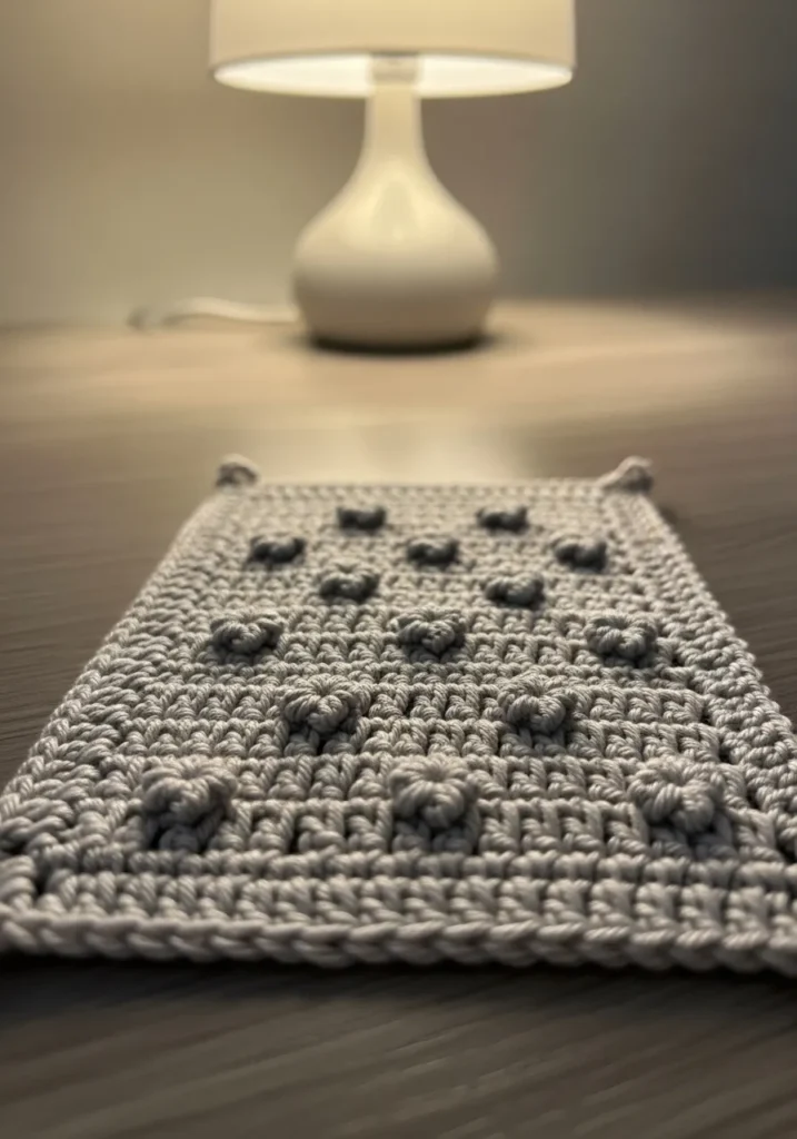 This soft gray crochet piece features evenly spaced bobble stitches that rise proudly from a smooth base. The chunky yarn enhances the three dimensional dots, giving the square a tactile, almost playful feel. The clean border frames the textured center perfectly, making the bobbles stand out without overwhelming the design.