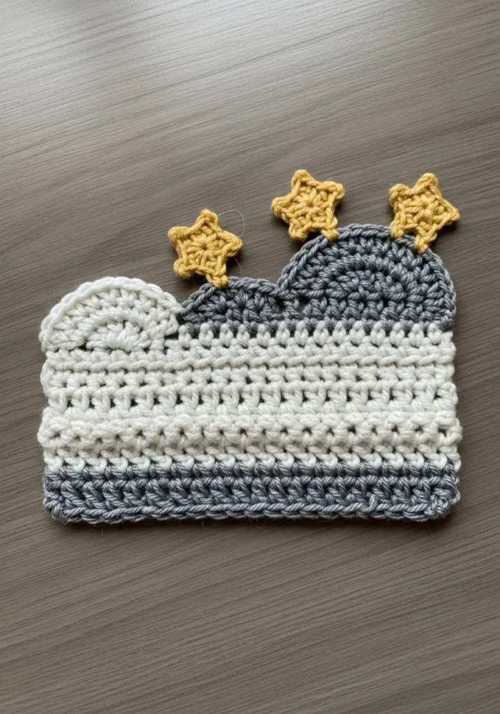 This adorable crochet patch combines neutral white and soft gray rows with curved shell shapes along the top edge, finished with tiny golden star appliqués for a whimsical touch. The base stitches are neat and structured, while the scalloped detailing adds movement and charm. The mix of textures makes it feel playful yet still cohesive.