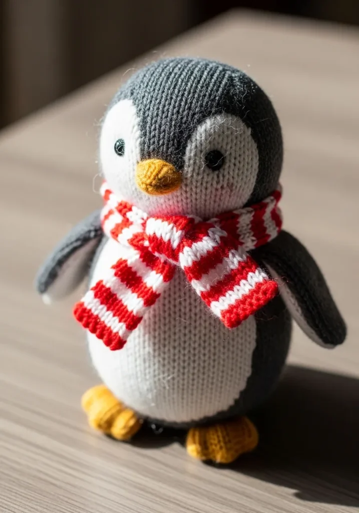 This knit penguin stands upright with a classic black and white body, bright yellow beak and feet, and the cutest red and white striped scarf wrapped snugly around its neck. The stitches are neat and smooth, giving the penguin a polished finish, while its rounded shape makes it look soft and huggable. The bold scarf adds a pop of color that instantly makes it feel winter ready and full of personality.