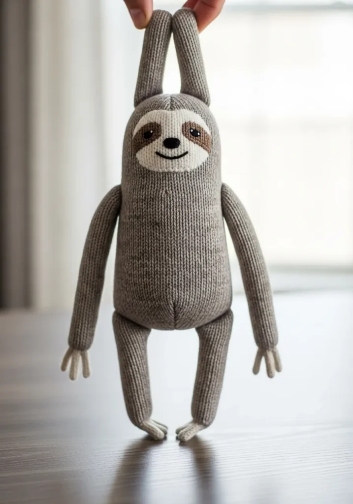 This tall knit sloth has a relaxed standing pose with long dangling arms and softly rounded legs. The neutral taupe and cream yarn keeps the design calm and modern, and the stitched facial features give it a gentle, sleepy charm. The texture looks smooth and even, making the silhouette clean and simple while still full of character.