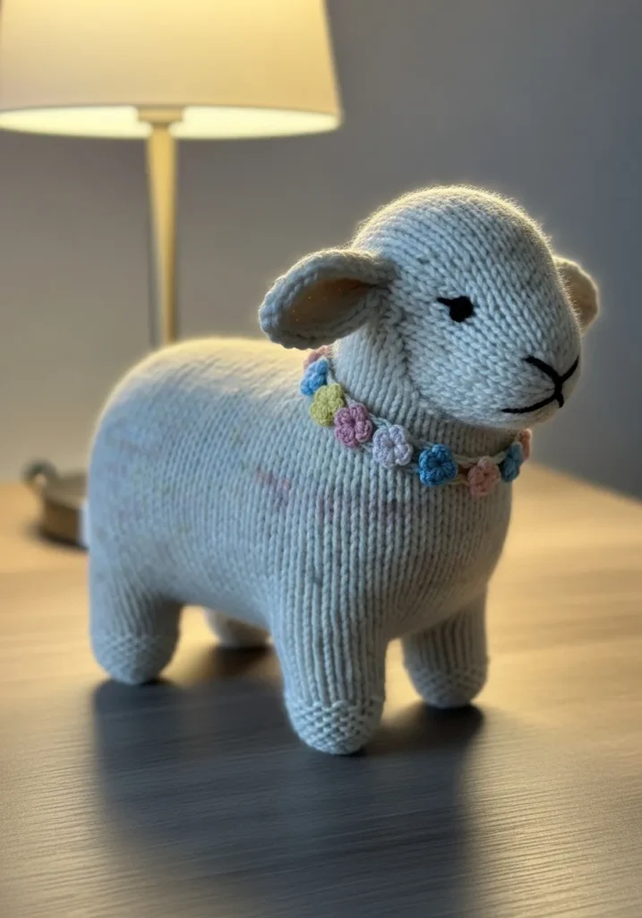 This soft knit lamb has a creamy white body with a smooth, rounded shape and tiny ears that frame its sweet face. Around its neck sits a delicate pastel floral necklace detail that adds a lovely handmade touch. The stitches look even and soft, giving the lamb a warm and comforting presence that feels perfect for spring inspired decor.