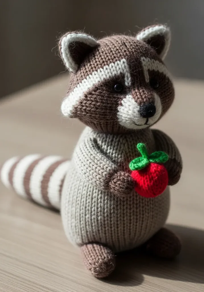 This knit raccoon has a chubby little body in soft gray and brown tones, complete with a striped tail and a tiny red apple held in its paws. The facial mask detail is neatly stitched, giving it that classic raccoon look while keeping everything cute rather than realistic. The apple adds a bright pop of color that makes the design feel lively and story driven.