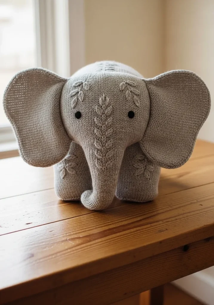 This knit baby elephant features a rounded gray body, oversized floppy ears, and a short curved trunk that gives it an irresistibly gentle look. The yarn appears soft and smooth, with subtle shaping that keeps the design clean and minimal. The neutral color palette makes it versatile and timeless, perfect for modern decor or baby gifts.