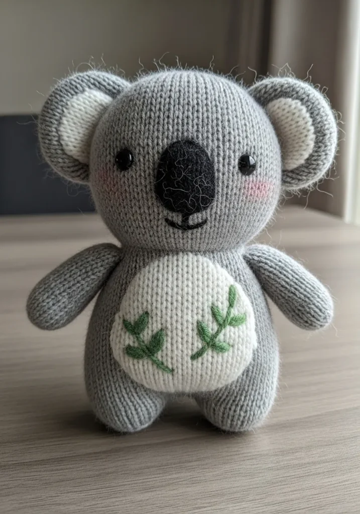 This adorable knit koala is made with soft gray yarn and features a rounded body, tiny arms, and slightly oversized ears that give it the cutest sleepy look. The smooth stockinette texture keeps the design clean and simple, while the white belly panel is decorated with delicate stitched green leaves for a subtle woodland touch. A small black nose and shiny safety eyes bring the face to life, making the whole piece feel gentle, cozy, and perfect for nursery decor or a handmade gift.