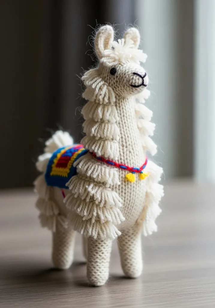 This knit llama stands proudly with textured stitches that mimic soft fluffy fur. Its creamy white body contrasts beautifully with a tiny colorful woven saddle detail across its back, adding a pop of playful charm. The upright ears and gentle embroidered face give it a calm yet quirky personality that feels full of character.