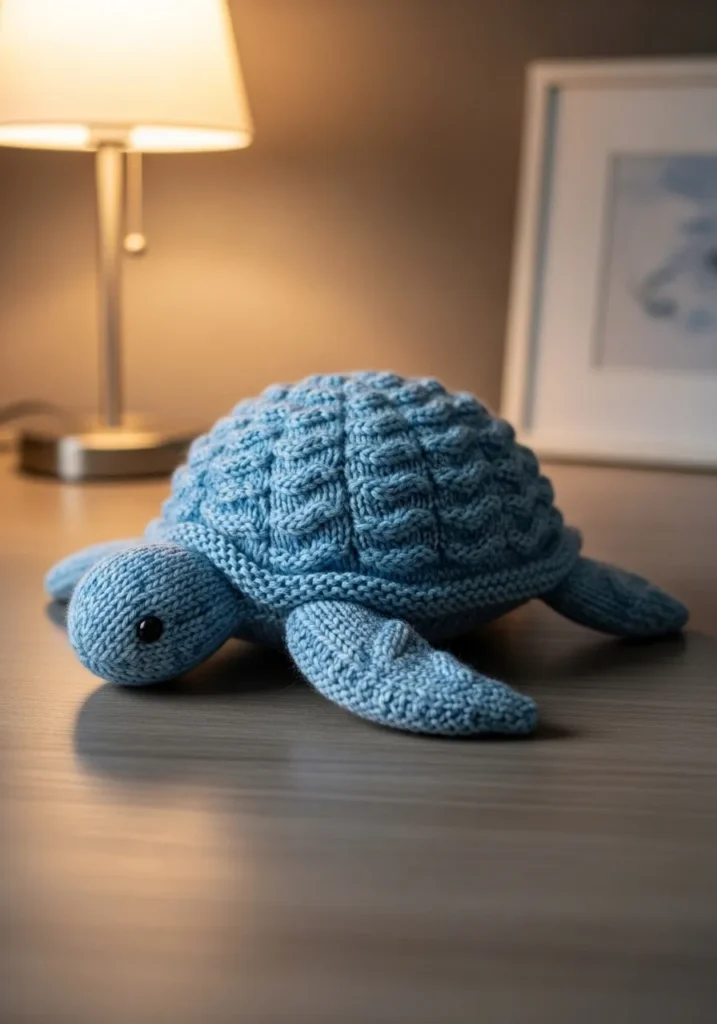 This knit turtle has a rounded blue shell featuring raised patterned sections that create a lovely dimensional effect. The head and flippers are softly shaped, giving it a relaxed and peaceful look. The combination of smooth stitches and textured shell panels makes the design visually interesting without being overwhelming.