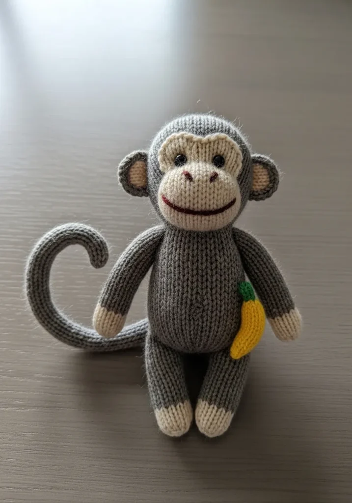 This knit monkey has a soft brown body, lighter face and belly, and an adorable curved tail that adds movement to the design. The rounded ears and sweet embroidered smile give it a friendly expression, while a tiny banana detail in its hand adds a fun storytelling element. The smooth stitches keep it neat and cuddly.