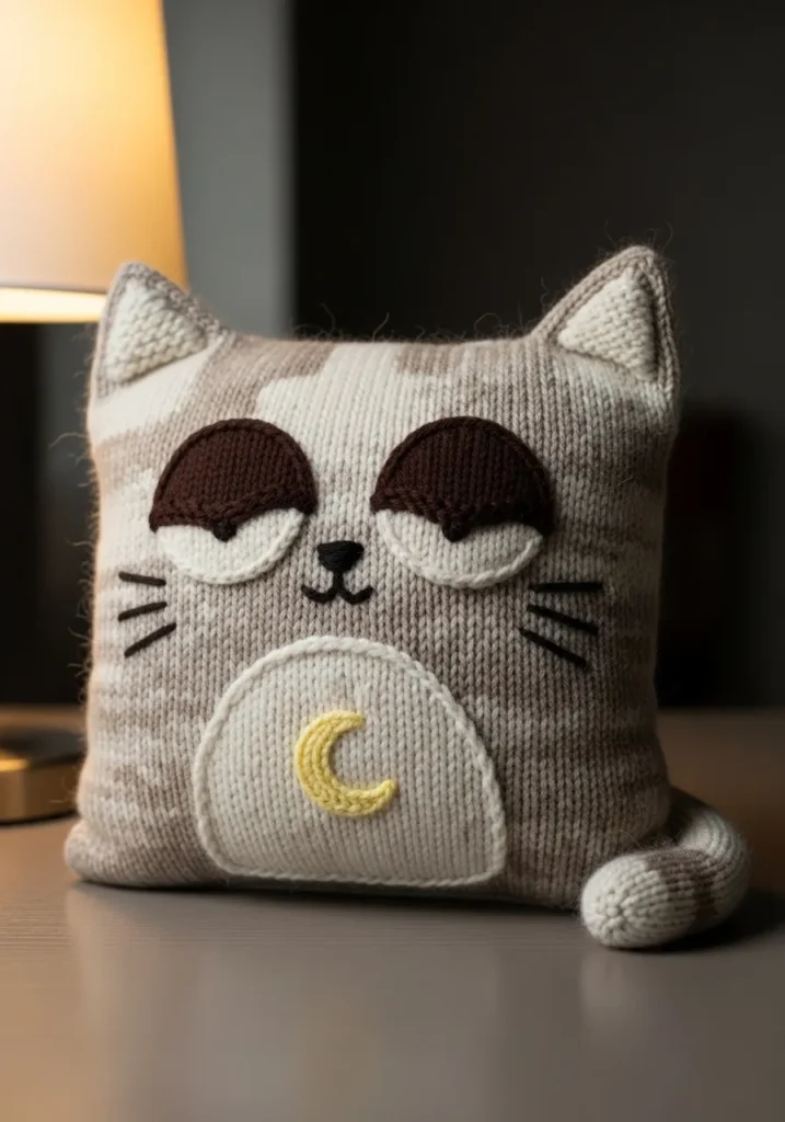 This knitted cat cushion features soft neutral tones with a creamy beige base and warm brown accents for the ears and embroidered details. The closed eyes, stitched whiskers, and tiny crescent moon motif on the belly give it a peaceful sleepy personality. Its square pillow shape makes it both decorative and practical, with smooth knit stitches that create a clean and modern look.