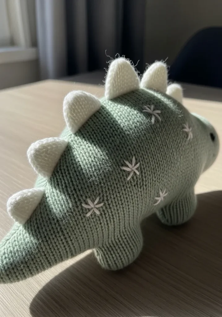 This charming knitted dinosaur is made with muted sage green yarn and finished with soft white spikes running down its back. The small embroidered star details on its body add a whimsical touch, while the rounded legs and gentle curves make it extra huggable. Its textured knit stitches give it that handmade warmth that makes every piece feel special.