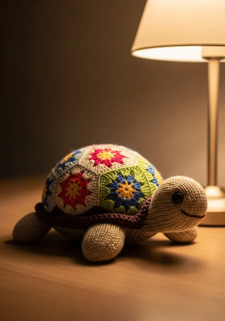 This adorable knitted turtle combines a neutral brown body with a bright multicolored shell decorated in small floral motifs. The contrast between the simple knit limbs and the detailed patterned shell creates a beautiful balance. Its low rounded shape and tiny stitched eyes make it look calm and content, almost like it is slowly strolling across a sunny table.