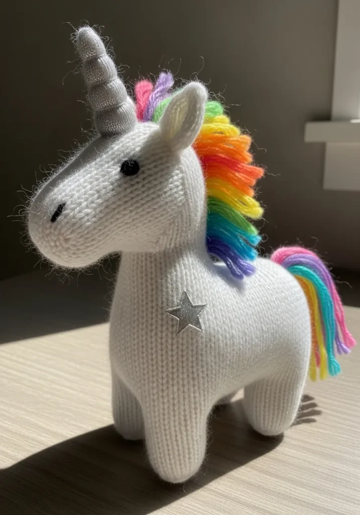 This dreamy knitted unicorn is made in soft white yarn with a fluffy rainbow mane and tail that instantly catch the eye. The gentle shaping of the legs and rounded body gives it a plush toy feel, while the small knitted horn and subtle star detail add a touch of magic. The smooth knit surface makes the colorful accents stand out beautifully.