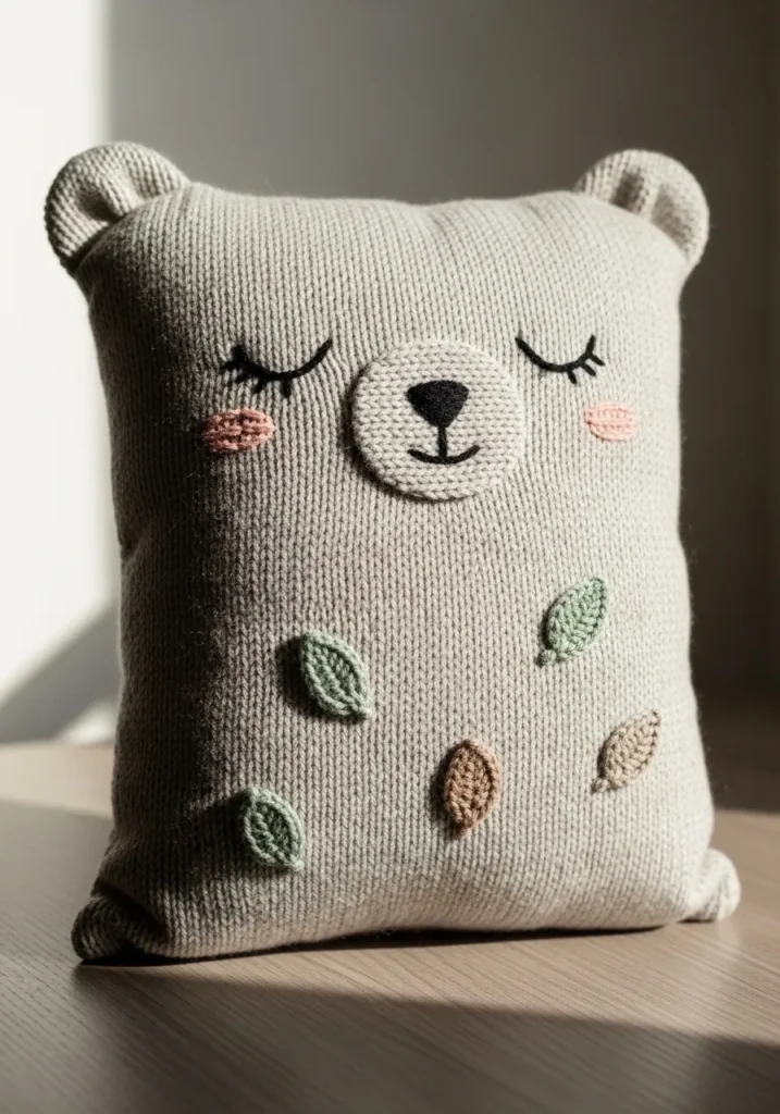 This charming knitted bear pillow is worked in a light neutral yarn with simple embroidered features that create a peaceful sleeping expression. Soft blush details on the cheeks and tiny leaf motifs stitched onto the front add a delicate decorative touch. Its square shape and clean knit texture give it a modern look that fits effortlessly into any cozy corner.