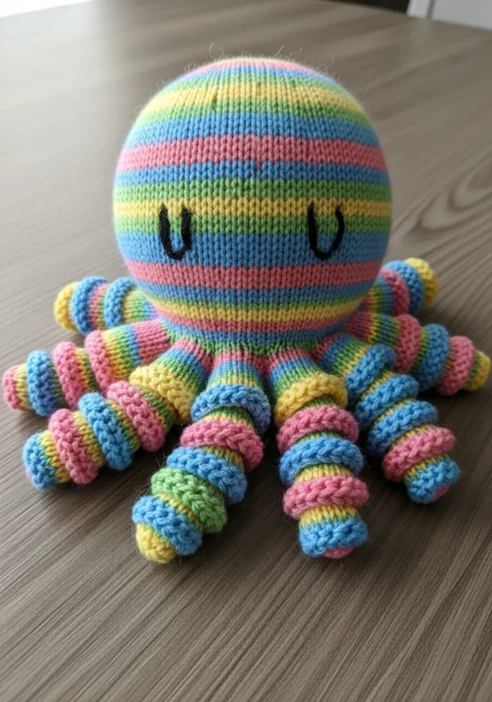 This cheerful knit octopus features soft pastel rainbow stripes that wrap around its round body and curly tentacles in the sweetest way. The yarn looks plush and cozy with smooth stockinette stitches, and the little embroidered sleepy eyes give it a calm and happy expression. Each tentacle is gently spiraled, adding playful movement and texture, while the bright color transitions make the whole design feel lively and fun without being overwhelming.