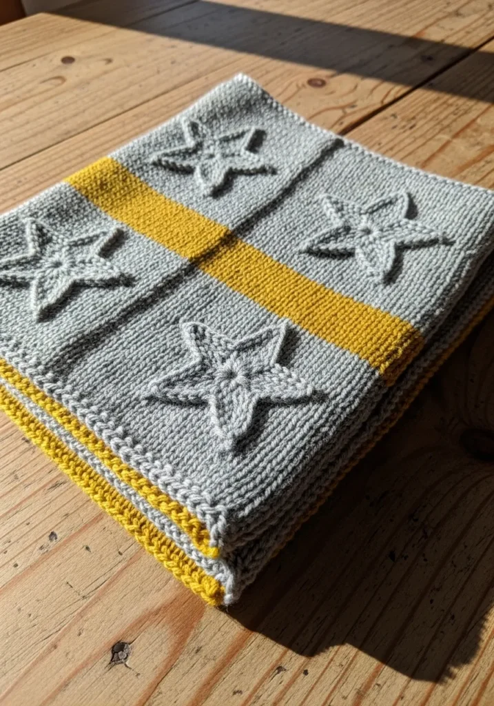 This knitted dishcloth features a soft gray base with beautifully raised textured stitches forming subtle star like motifs across the surface. A cheerful mustard yellow stripe runs across the middle, adding contrast and personality. The cotton yarn gives it a practical feel while the detailed texture keeps it visually interesting and far from basic.