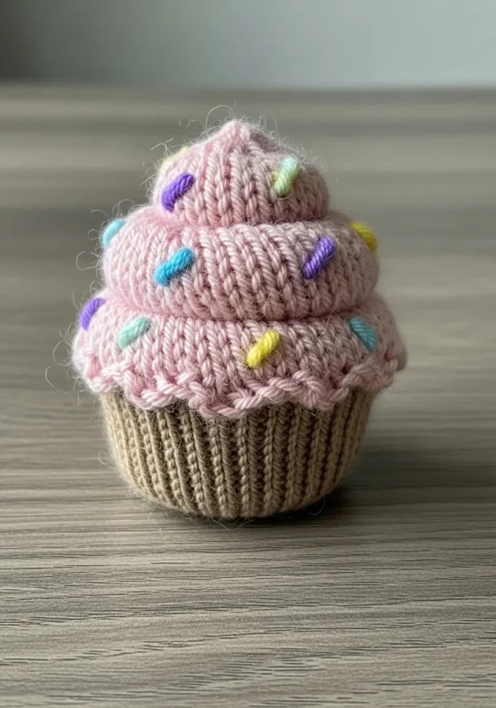 This sweet knitted cupcake plush is made with a beige ribbed base that mimics a cupcake wrapper and topped with fluffy pastel pink yarn shaped like swirled frosting. Tiny colorful sprinkle stitches are scattered on top, adding pops of blue, yellow, and purple. The soft yarn and rounded shaping make it look irresistibly squishy and decorative.