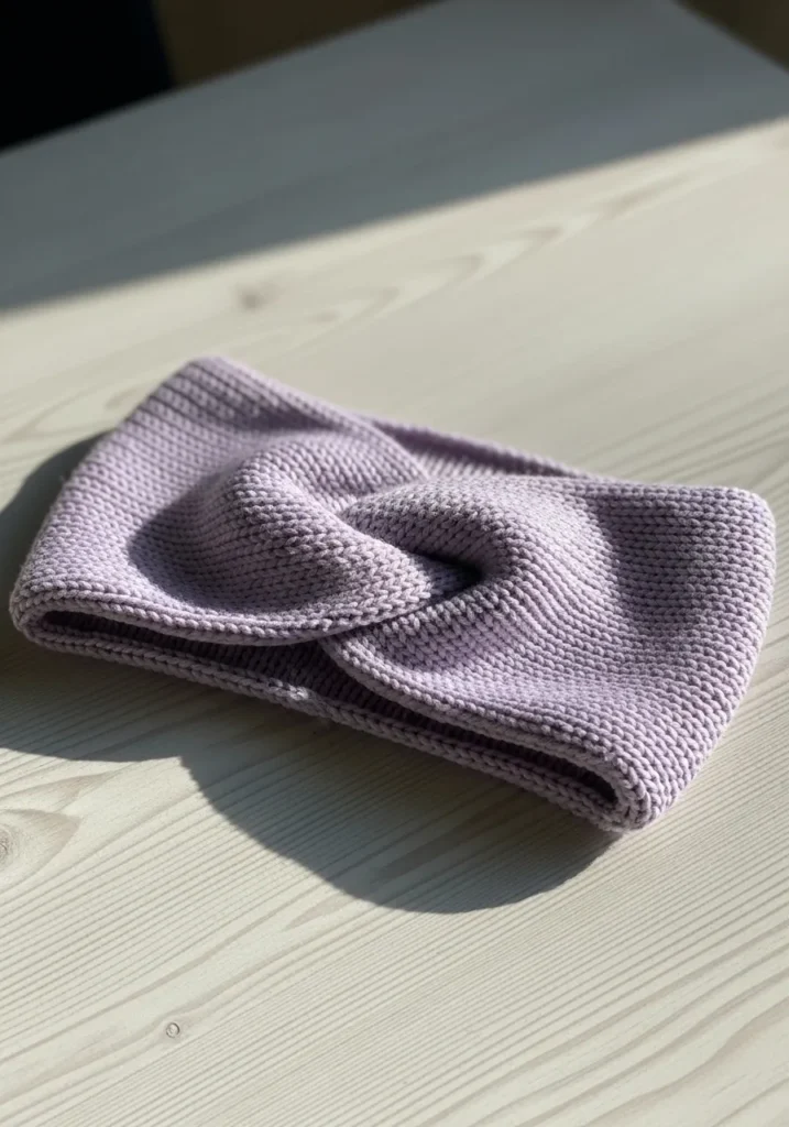 This cozy knitted headband is crafted in a soft lavender yarn with a smooth, stretchy texture and a twisted knot detail at the front. The stitch work looks clean and even, giving it a polished finish while still feeling warm and snug. Its minimal design makes it easy to pair with everyday outfits.