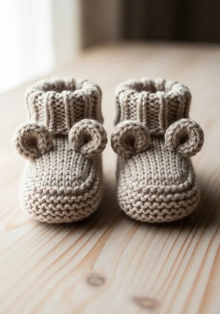 These adorable knitted baby booties are crafted in a soft neutral beige yarn with ribbed cuffs and tiny rounded ears attached near the ankle. The stitches look snug and stretchy, giving them a cozy and secure shape. Their simple design keeps them sweet and timeless.