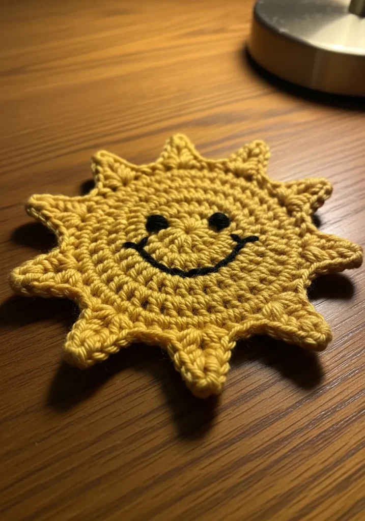 This bright knitted sun coaster is made with vibrant yellow yarn shaped into playful rays around a circular center. The surface features a stitched smiley face that gives it personality and warmth. The slightly textured stitches add depth while keeping the overall look simple and cheerful.