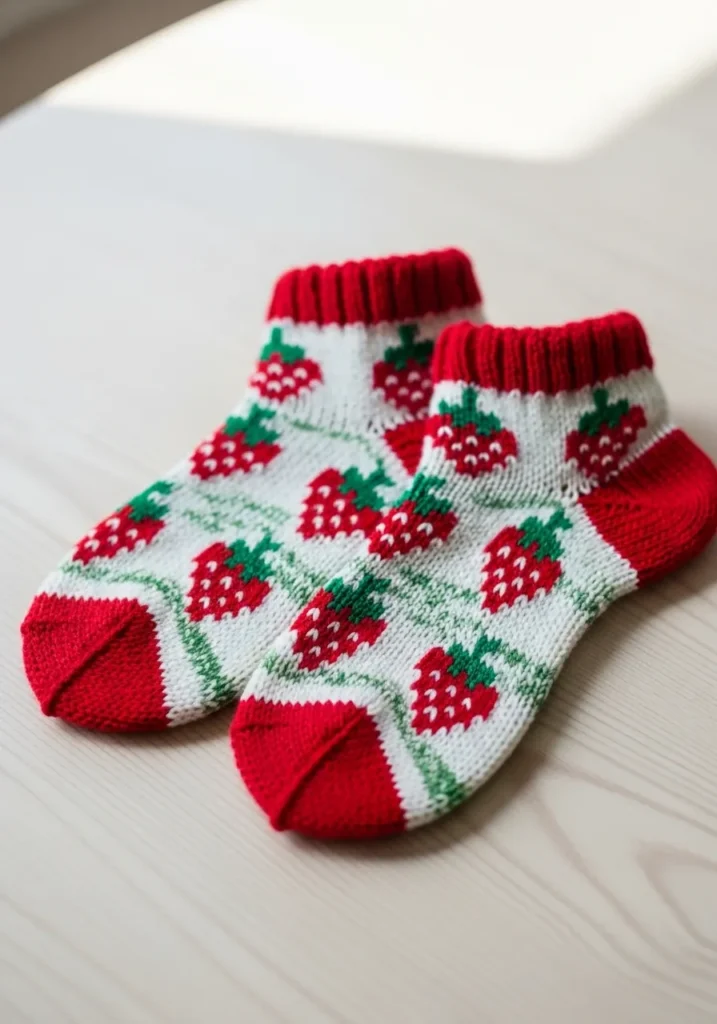 These adorable knitted ankle socks are made with soft white yarn and finished with bright red cuffs, heels, and toes for a playful pop of color. The tiny strawberry motifs scattered across the fabric add the sweetest touch, with little green tops and textured red stitches that make them stand out beautifully. The ribbed cuff keeps them snug while the smooth stockinette body shows off the cheerful pattern in the cutest way.