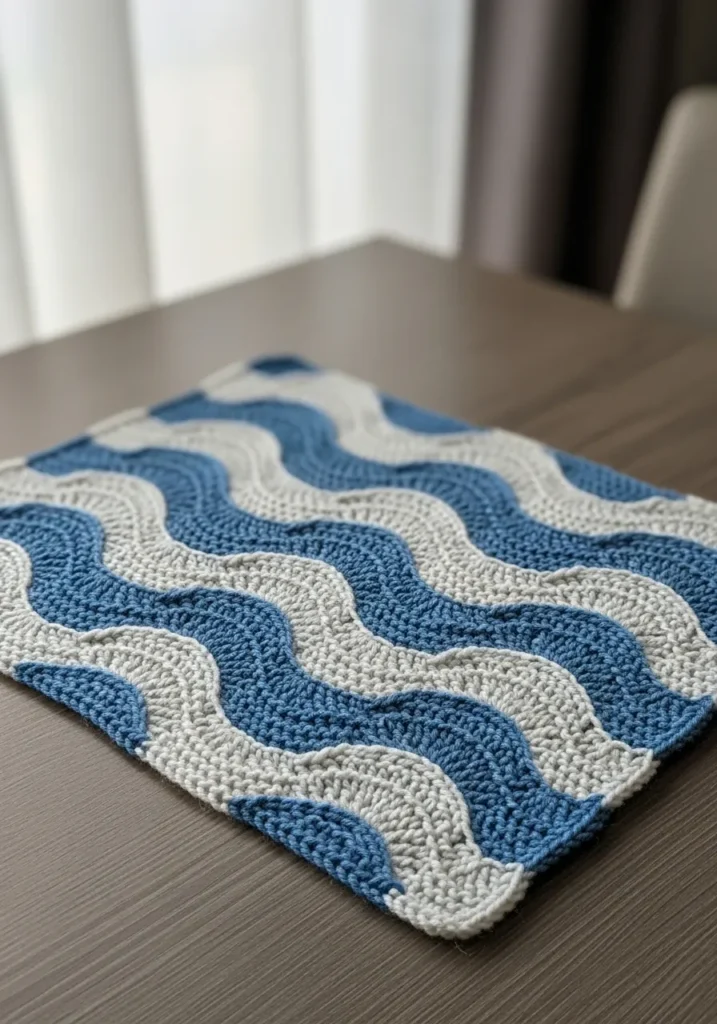 This knitted dishcloth features soft wave patterns in alternating shades of blue and white, creating a gentle ripple effect across the square design. The textured stitches add visual interest while keeping the fabric sturdy and absorbent. Its clean edges and balanced color combination give it a fresh, coastal vibe.