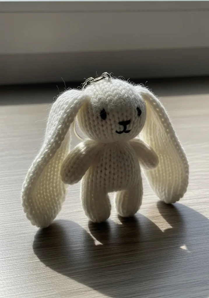 This small knitted bunny is made from creamy white yarn with long floppy ears and a petite embroidered face. The stitches are tight and even, giving the plush a smooth, soft appearance. Its simple body shape and slightly oversized ears make it irresistibly cute and perfect for little hands.
