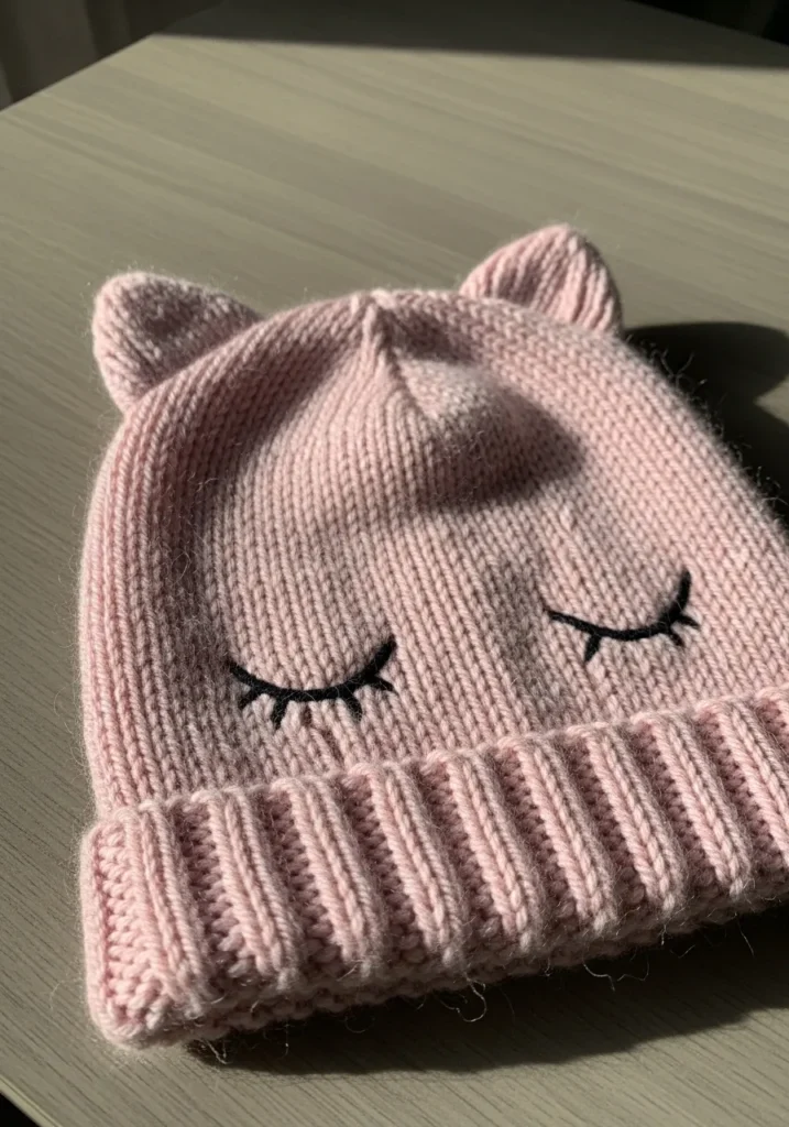 This adorable knitted beanie is made from soft blush pink yarn with a smooth stockinette body and a thick ribbed brim that gives it that cozy, stretchy fit. Two tiny cat ears sit neatly at the top, shaped with simple decreases for a clean finish. The closed eyes are stitched on in black yarn, adding the sweetest sleepy expression. You can even spot a bit of natural yarn fuzz and subtle texture in the stitches, which makes it feel genuinely handmade and extra charming.
