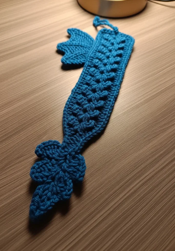 This knitted bookmark is shaped like a tiny dragon tail and it is such a fun twist on a classic reading accessory. It is worked in a rich teal blue yarn with textured stitches running down the center to mimic scales. The top features a small loop for hanging, along with little wing details that add extra fantasy flair. The bottom flares out into a decorative tail fin with layered knit shaping that gives it movement and dimension. The yarn looks soft yet structured, with visible stitch definition that highlights every scale like detail.